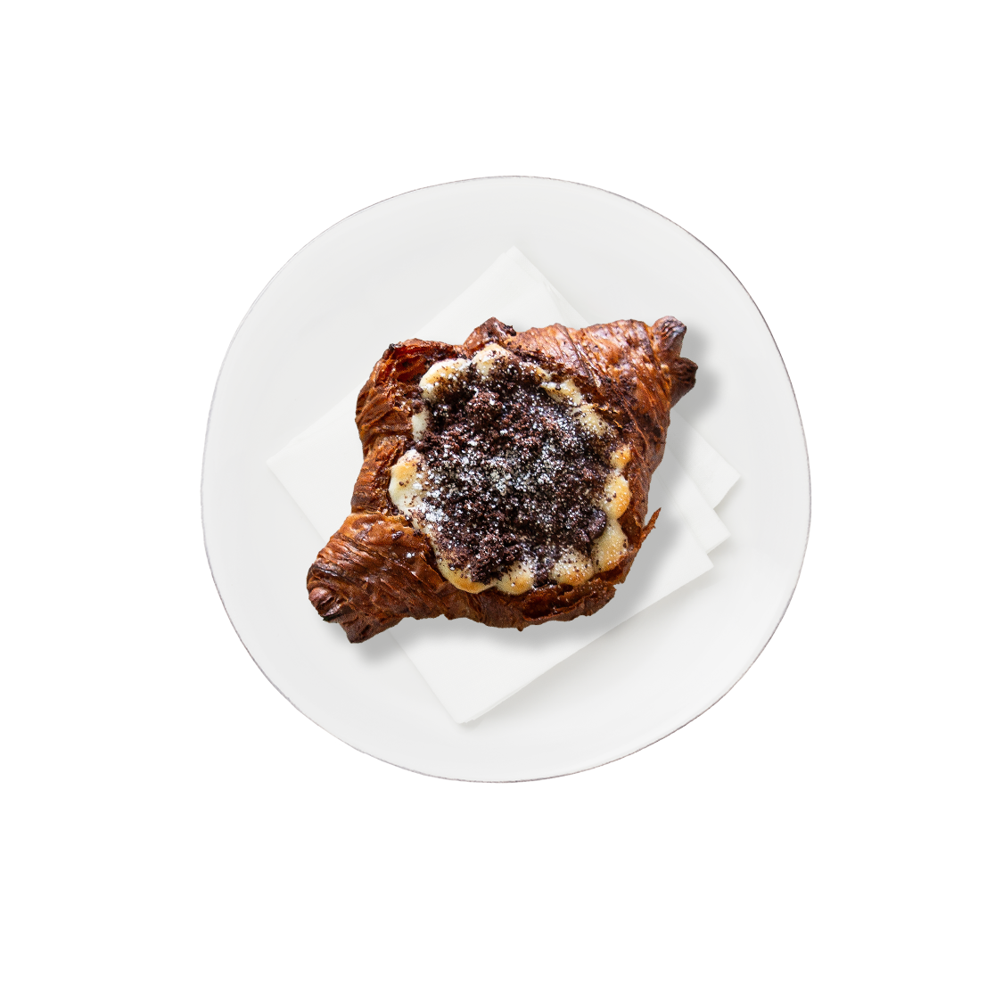 Our butter croissant is toasted, brushed with coffee syrup, and topped with a cream cheese filling and chocolate streusel for a crispy, creamy finish. Contains: Milk, Eggs, Wheat